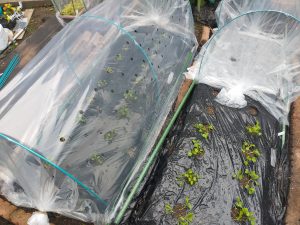 家庭菜園もさすがに、朝の寒さで弱ってくるのと、昼間の成長を促進するために寒さ対策。