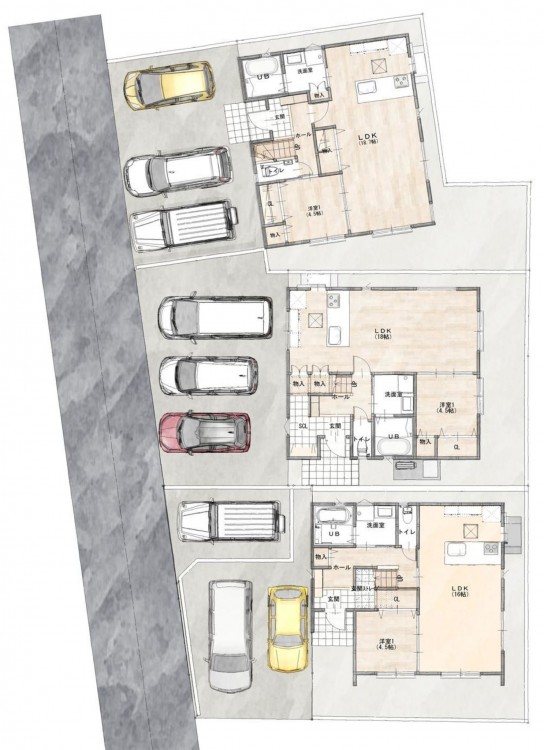 - 24時間換気システム、オール電化、モニタ付インターホン、複層ガラス、システムキッチン、カウンターキッチン、食器洗浄乾燥機、IHクッキングヒーター、浄水器、シャンプードレッサー、浴室乾燥機、追い焚き、洗浄便座、トイレ2箇所、床下収納、ウォークインクローゼット、駐車場2台分、駐車場3台分、シャッター、電気、ディンプルキー、火災報知機