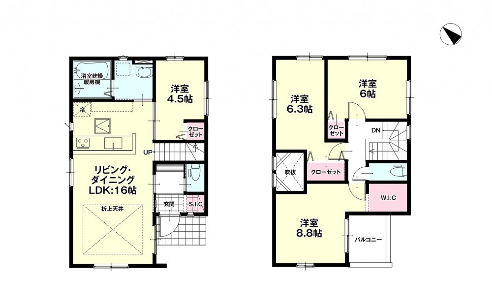 - モニタ付インターホン、システムキッチン、カウンターキッチン、食器洗浄乾燥機、シャンプードレッサー、浴室乾燥機、洗浄便座、トイレ2箇所、床下収納、ウォークインクローゼット、駐車場2台分、キッチンに窓、コンロ口数(3口以上)、電気、浴室暖房、オートバス、全居室収納、玄関収納