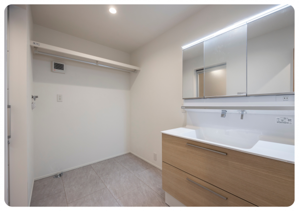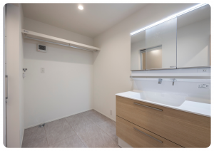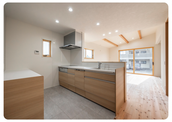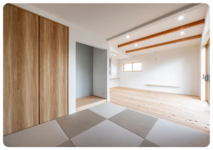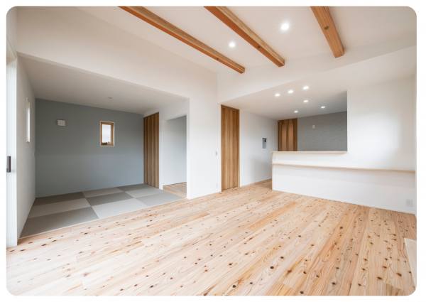 お家全体に広がるのは、杉の浮造り無垢床。やさしい足ざわりと自然な風合いが、毎日の暮らしにぬくもりを届けてくれます。リビングには、木の梁が印象的な勾配天井を採用。リビング横には畳スペースがゆるやかに繋がります。
